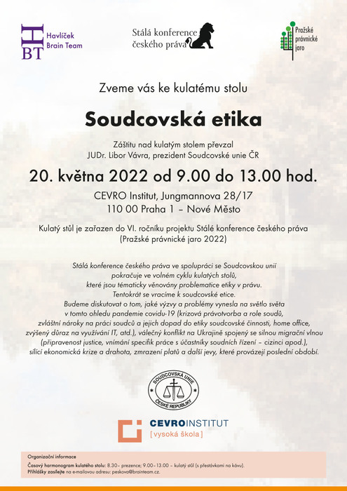 Kulatý stůl na téma soudcovská etika se bude konat 20. 5. 2022 v CEVRO institutu.